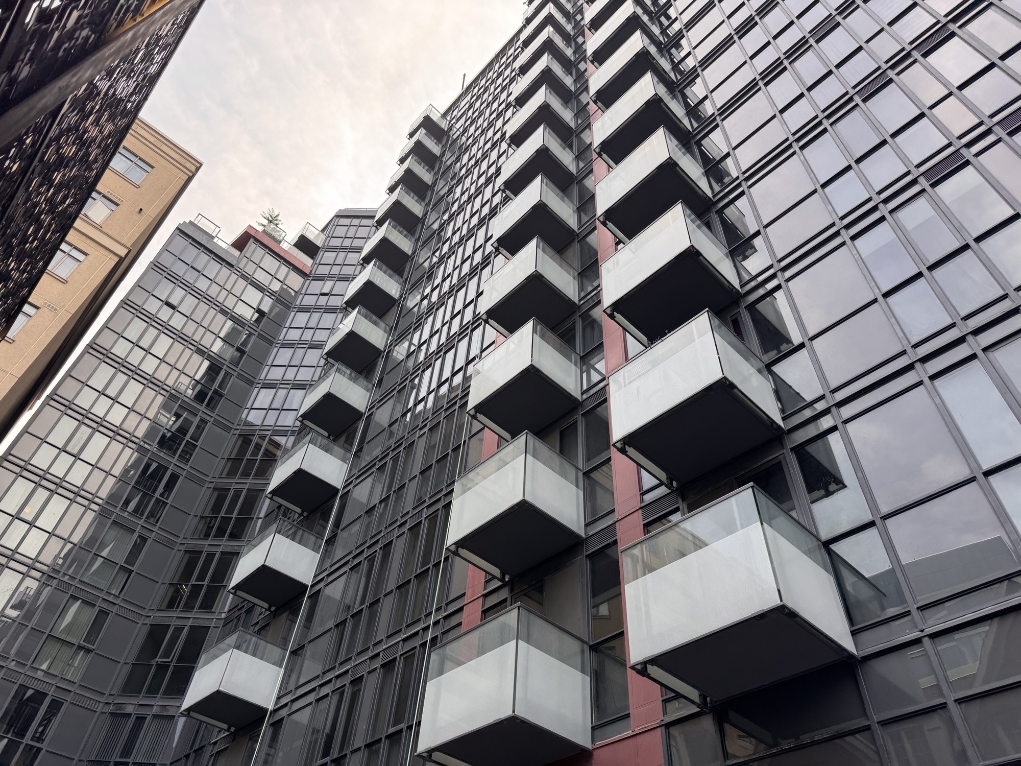 The building features balconies on all elevations, constructed of conventionally reinforced cast-in-place concrete slabs, cantilevered from the floor structure. Guards consist of prefinished aluminum rails and posts with tempered glass infill panels, anchored to the slab edges. Shared terraces are separated by opaque glass dividers in aluminum frames.